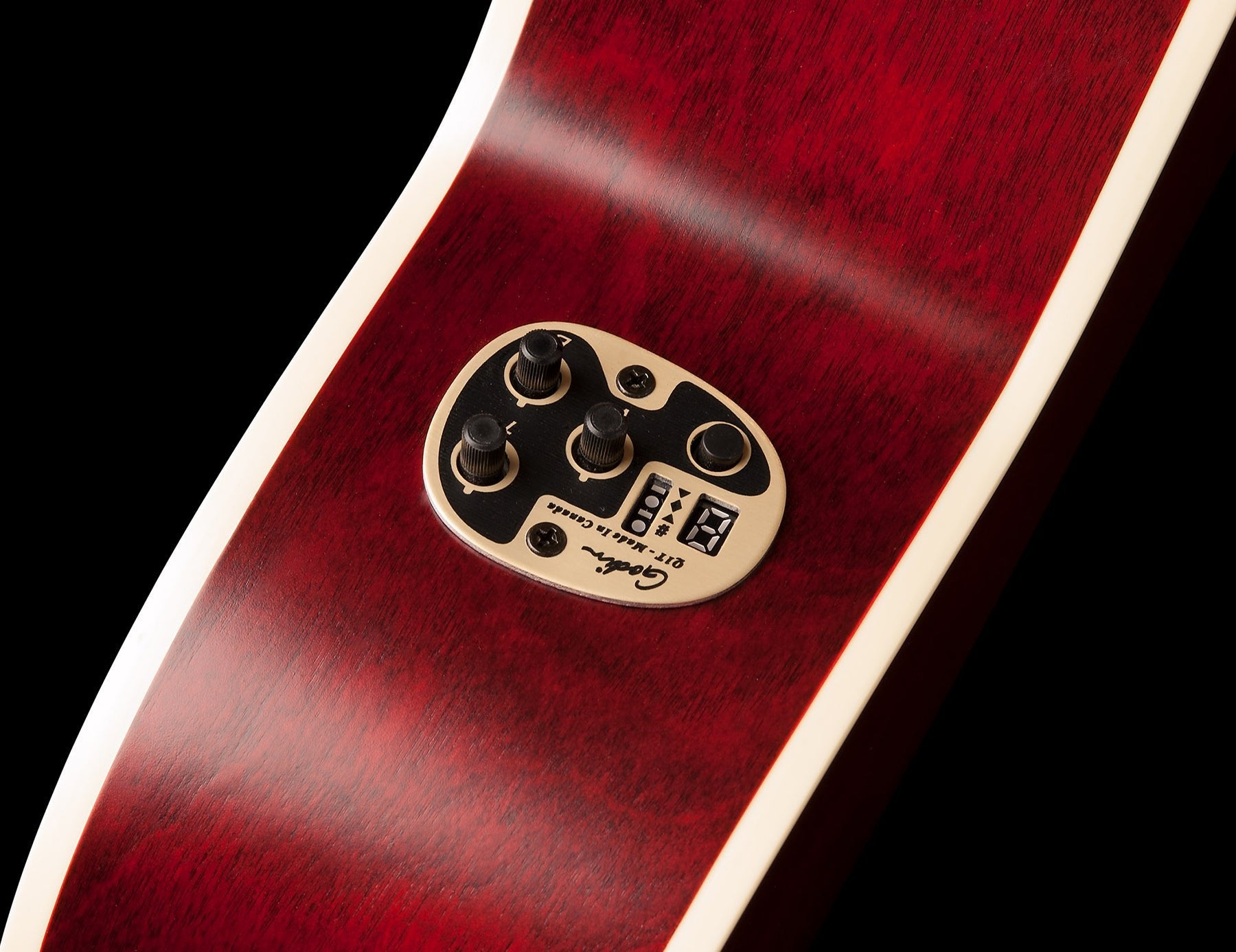 The Godin Q1T acoustic guitar system is simple in design and outstanding in performance. In combination with the transducer, the EQ control range and frequency content have been specifically contoured to provide a very rich and full sound reproduction resulting in performance seen only in far more complex systems. Features volume, treble and bass controls as well as a built-in tuner with auto shut-off.