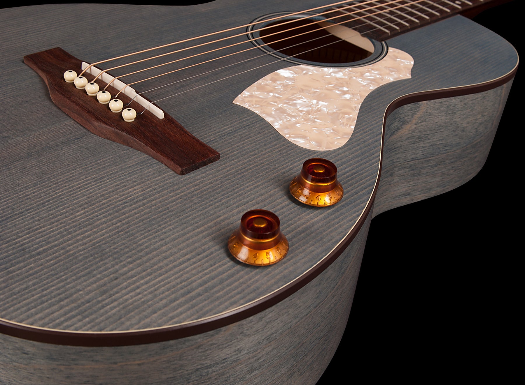 The Roadhouse Denim Blue Q-Discrete comes equipped with a Q-Discrete preamp with tone and volume controls on the body.