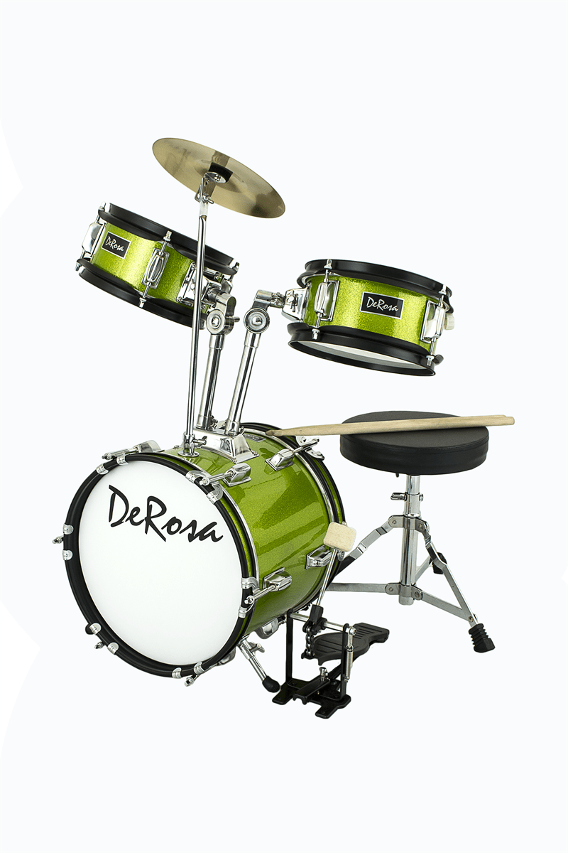 De Rosa USA 3 Piece 12 inch junior drum set for kids with bass drum, snare, tom, cymbal, stool, pedal, and sticks in green