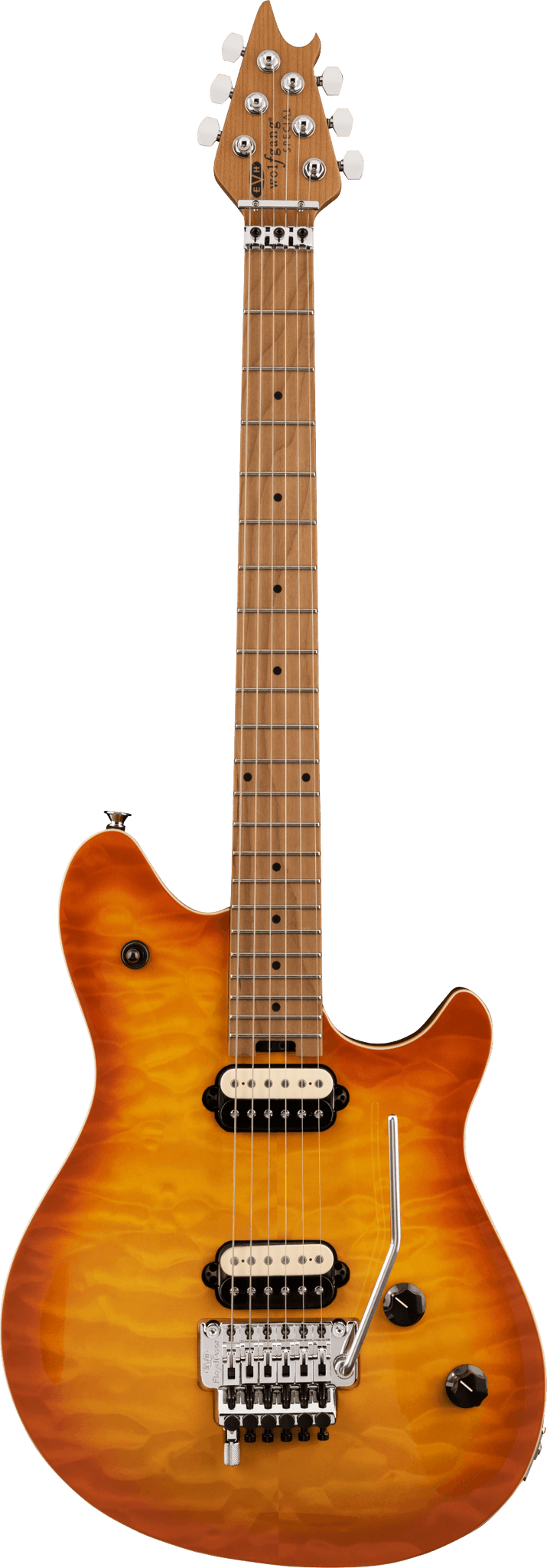 A pair of flagship custom-designed EVH® Wolfgang Alnico 2 humbucking pickups are mounted directly to the body, providing dynamic yet articulate voicing, as well as endless sustain for powerful chords and melody lines. A sturdy and dependable EVH-branded Floyd Rose® locking trem and Floyd Rose locking nut work in tandem for precise tuning even with extreme changes in pitch, while the EVH D-Tuna® retunes to drop-D and back with strict accuracy at the flick of a finger. The volume knob with treble bleed circuit has a 500K EVH Bourns® low friction pot for smooth swells and a tone control knob with a 250K Bourns high friction tone pot that prevents accidental tone shifting.