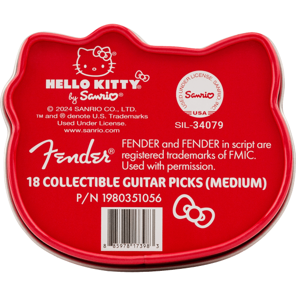 Featuring a collector’s tin in the shape of Hello Kitty herself, Fender® x Hello Kitty® Pick Tin contains 18 medium celluloid picks printed with the unmistakable logos of both brands. With its charming style and reusability, this pick tin is a must-have collector’s item for players and fans alike!