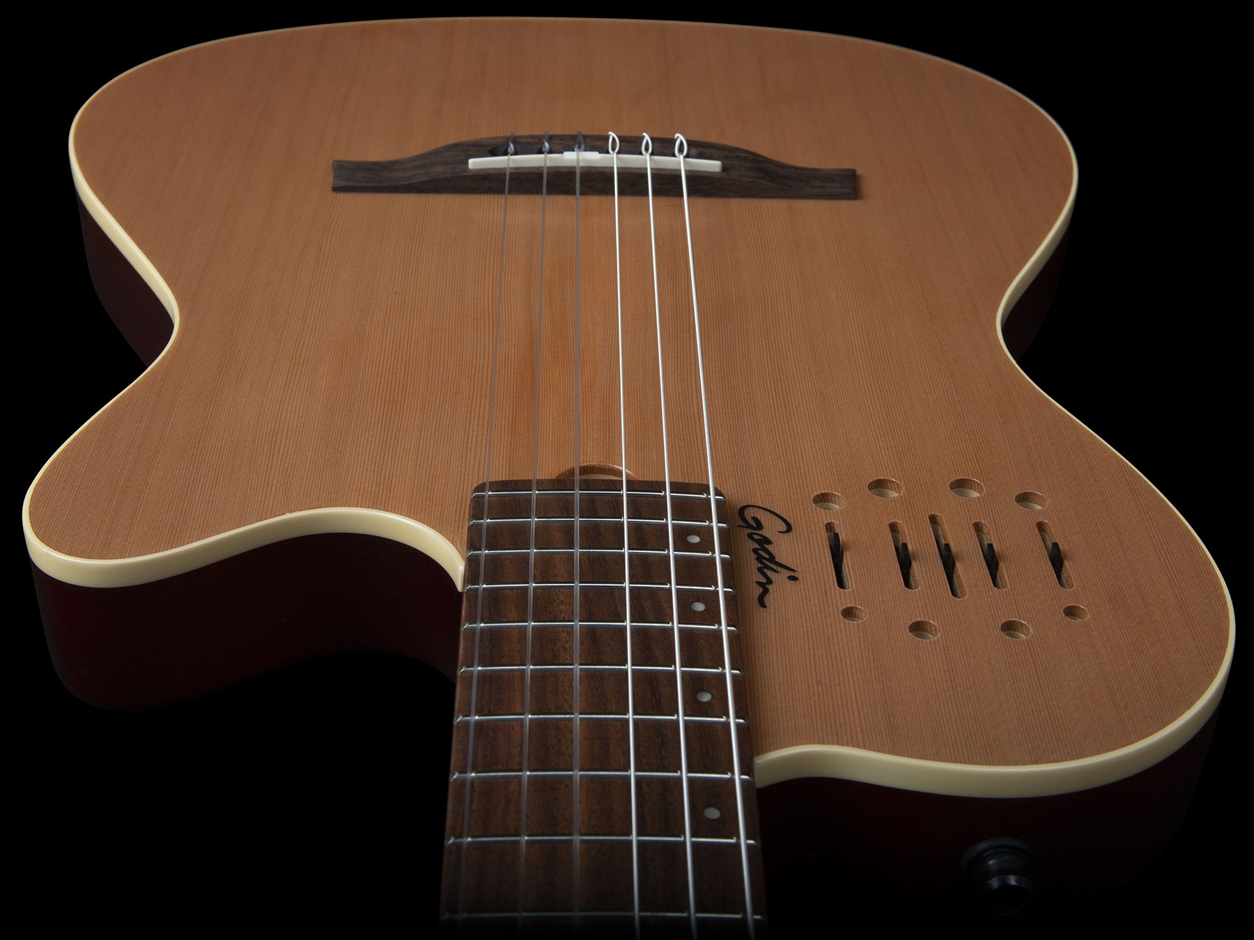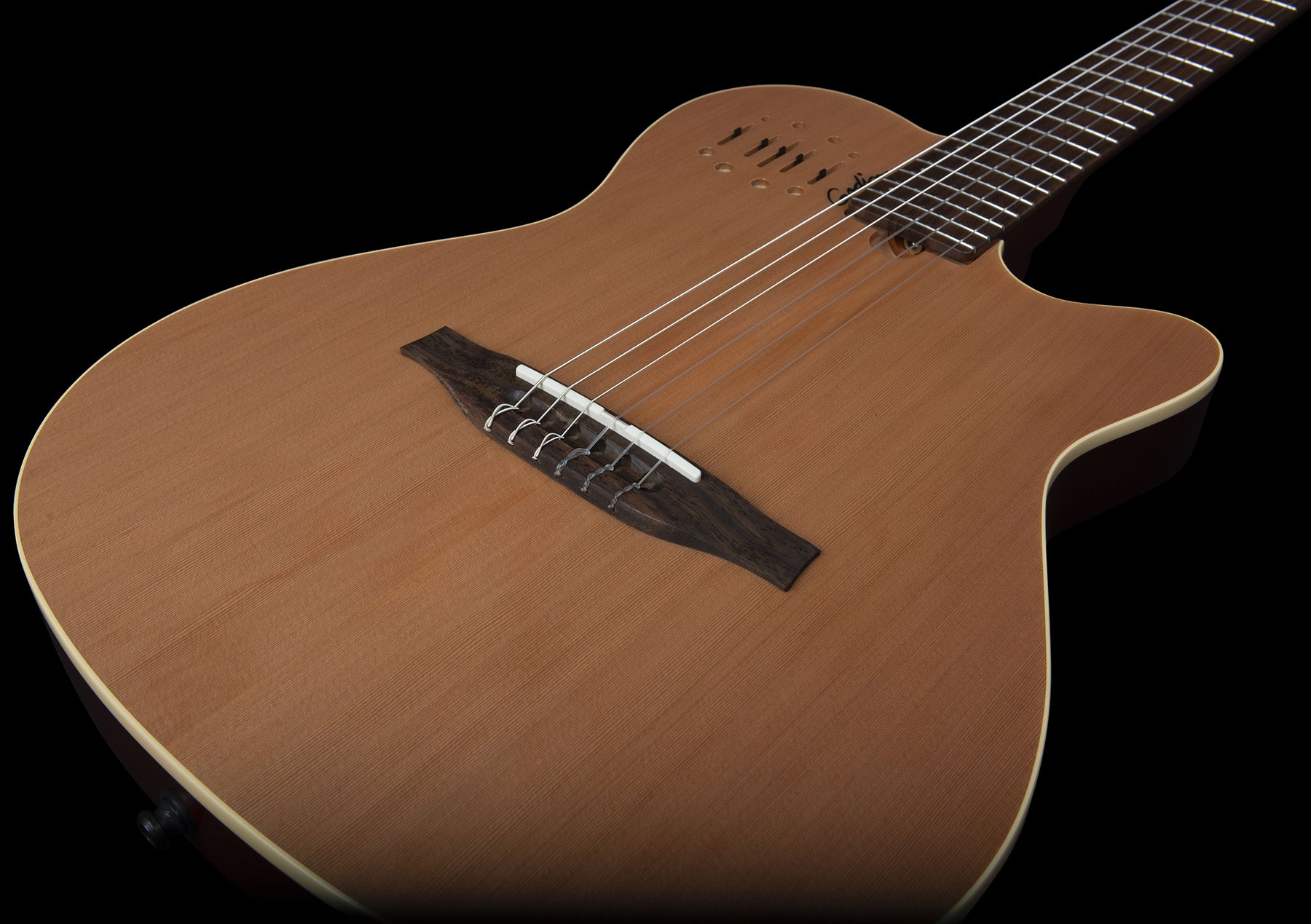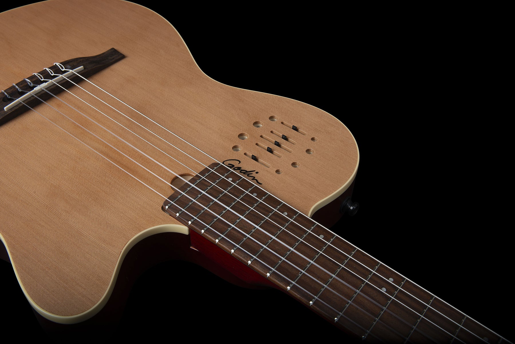 The Multiac Encore nylon string, also features a 25 ½" scale and a comfortable nut width, making it easy for electric steel string players to transition to nylon strings. This model features a chambered silver leaf maple body with a solid cedar top, as well as a dual source preamp with volume, treble, mid, bass and blend control sliders.