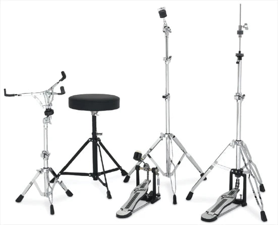 The Gretsch Renegade hardware value pack is the ideal solution for any aspiring drummer with the need to complete their drum setup. This full pack includes a straight stand, Hi-Hat stand, snare stand, bass drum pedal, and drum throne. Some features include a double-braced tripod base, low-profile rubber feet, and newly designed Gretsch logo foot boards on the bass drum pedal and Hi-Hat stand.