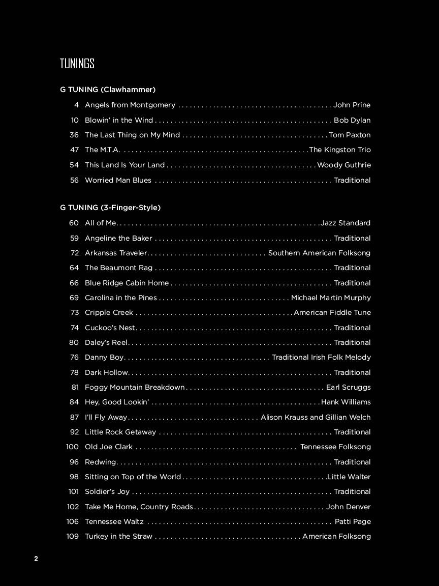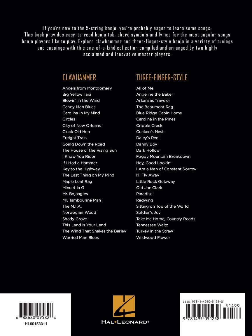 If you're new to the 5-string banjo, you're probably eager to learn some songs. This book provides easy-to-read banjo tab, chord symbols and lyrics for the most popular songs beginning banjo players like to play. Players with years of experience will also discover tunes never before arranged for banjo. Explore clawhammer and three-finger-style banjo in a variety of tunings and capoings with this one-of-a-kind collection of master-crafted arrangements. Songs include: Angel from Montgomery • Blowin' in the Wind • Carolina in My Mind • Cripple Creek • Danny Boy • The House of the Rising Sun • I Am a Man of Constant Sorrow • Maple Leaf Rag • Mr. Tambourine Man • Shady Grove • Take Me Home, Country Roads • This Land Is Your Land • Wildwood Flower • and many more.