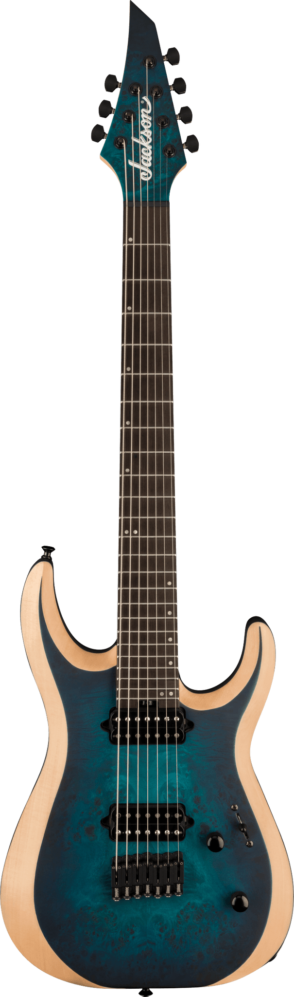 Featuring a 26.5" scale length, this modern 7-string hardtail guitar also boasts unparalleled tone with a resonant basswood body draped with a polar burl top complete with a reverse 3x4 AT-1 matching headstock with and black hardware.