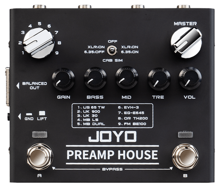 Preamp House is the newly released pedal from JOYO R series, delivering 9 amps€™ preamps in one pedal! It has 65Twin / JCM900 / AC30 / LONESTAR / DUAL RECTIFIER / 5150 / POWERBALL / TH200 / BE100 and more, each amp features clean channel and distortion channel and can be switched by Footswitches( 18 tones in all)! Due to the 2 channel design, you can switch easily between Fenders Clean and Marshalls Distortion! One built-in cabinet simulation facilitates stage performance. FX LOOP interface for external FX pedal, balanced Output. Preamp House is an user-friendly and stable tone solution for musicians who perform and record frequently.
