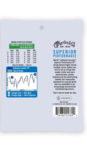 Martin® Authentic Acoustic® Superior Performance SP® strings feature higher tensile strength and tin-plated core wire on all six strings that enable a fuller and more balanced tone, quicker response and increased tuning stability. Our impeccable standards for acoustic guitar tone are embedded in our string design and precision manufacturing process. That's why we make our own.