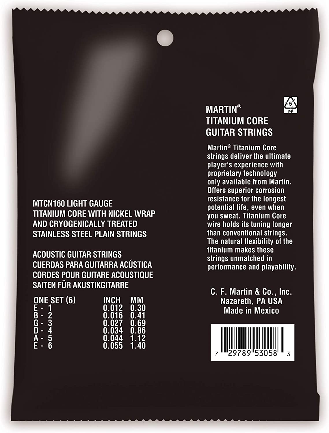 Martin Titanium Core strings deliver the ultimate player’s experience with patented technology from Martin. Titanium Core strings provide the most superior intonation and tuning stability of any string on the market. Titanium is naturally more flexible than steel, but just as strong, so the strings are easier to press, reducing finger fatigue. The combination of titanium and pure nickel used in our Titanium Core strings provides natural corrosion resistance, meaning they will last a really, really long time under normal circumstances.