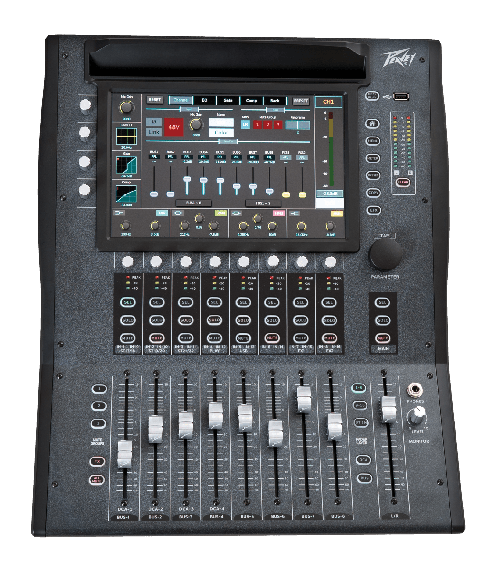 The foundation of the Peavey Aureus 28 digital mixer is professional quality audio in an easy to use package. The 10" multi-touch display allows users to access almost any control with just a couple of taps. Fifty-nine dedicated controls allow access to most critical functions with a single touch, making the Aureus the easiest to use digital mixer to date. No fumbling through endless menus - just touch the feature you want to access and adjust.