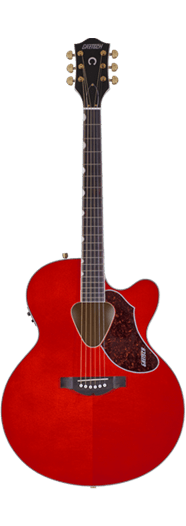 Premium features include a solid spruce top with scalloped "X"-bracing and the traditional Gretsch Rancher triangular soundhole, flame maple back and sides, mahogany neck, 21-fret laurel fingerboard with Neo-Classic™ thumbnail inlays, 1940s-style pickguard with Gretsch logo, compensated bridge with laurel base, gold-plated hardware and deluxe die-cast tuners. Onboard Fishman® electronics include a Sonicore undersaddle pickup and Isys preamp system with onboard tuner, battery life indicator and controls for volume, treble, bass and phase.