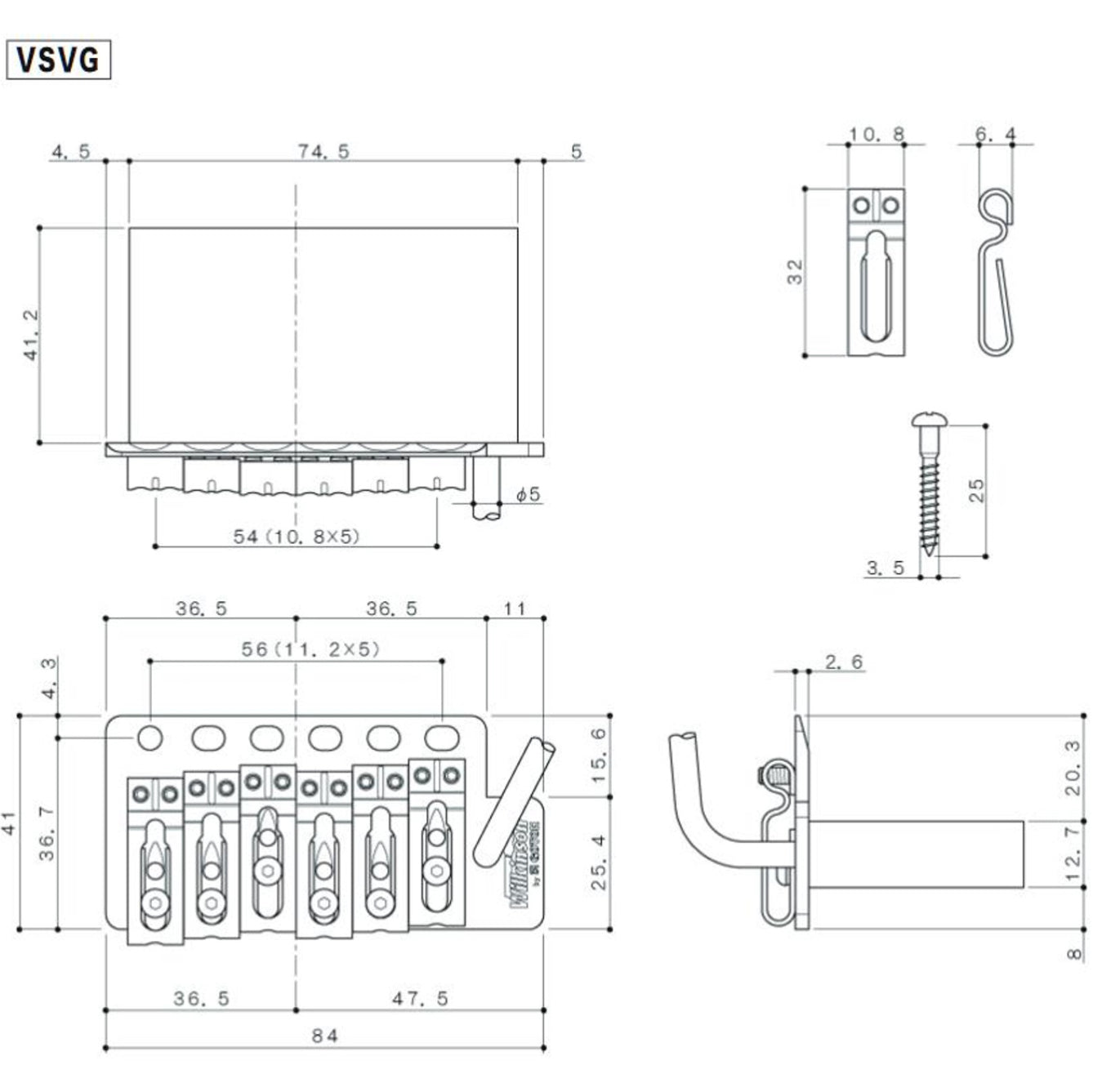 If you are looking for a tremolo that is designed for enhanced sustain and better reliability, then you have found it. The VSVG Vintage tremolo features enlongated baseplate holes so the screws won't bind and it gives a very smooth, accurate return to pitch. With the string mounting holes being staggered in the steel block you will find much more tuning stability because of the more consistent string angle over the adjustable locking bent-steel saddles.