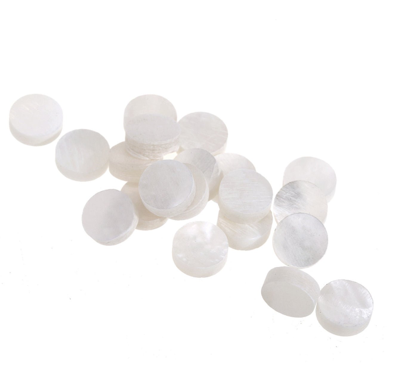 Genuine mother of pearl inlay dots. Nominally 1/4 inch (diameter actually measures 6.35mm-6.55mm with 2-2.5mm thickness).