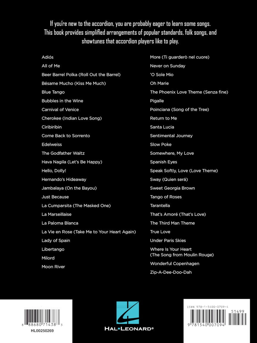 Si vous êtes nouveau à l'accordéon, vous êtes probablement désireux d'apprendre quelques chansons. Ce livre propose 50 arrangements simplifiés de standards populaires incontournables, de chansons folkloriques et d'airs de spectacle, notamment : All of Me • Beer Barrel Polka • Carnival of Venice • Edelweiss • Hava Nagila (Let's Be Happy) • Hernando's Hideaway • Jambalaya (On the Bayou) • Dame d'Espagne • Moon River • 'O Sole Mio • Voyage sentimental • Quelque part, mon amour • C'est Amore (C'est l'amour) • Under Paris Skies • et plus encore. Inclut les paroles le cas échéant.