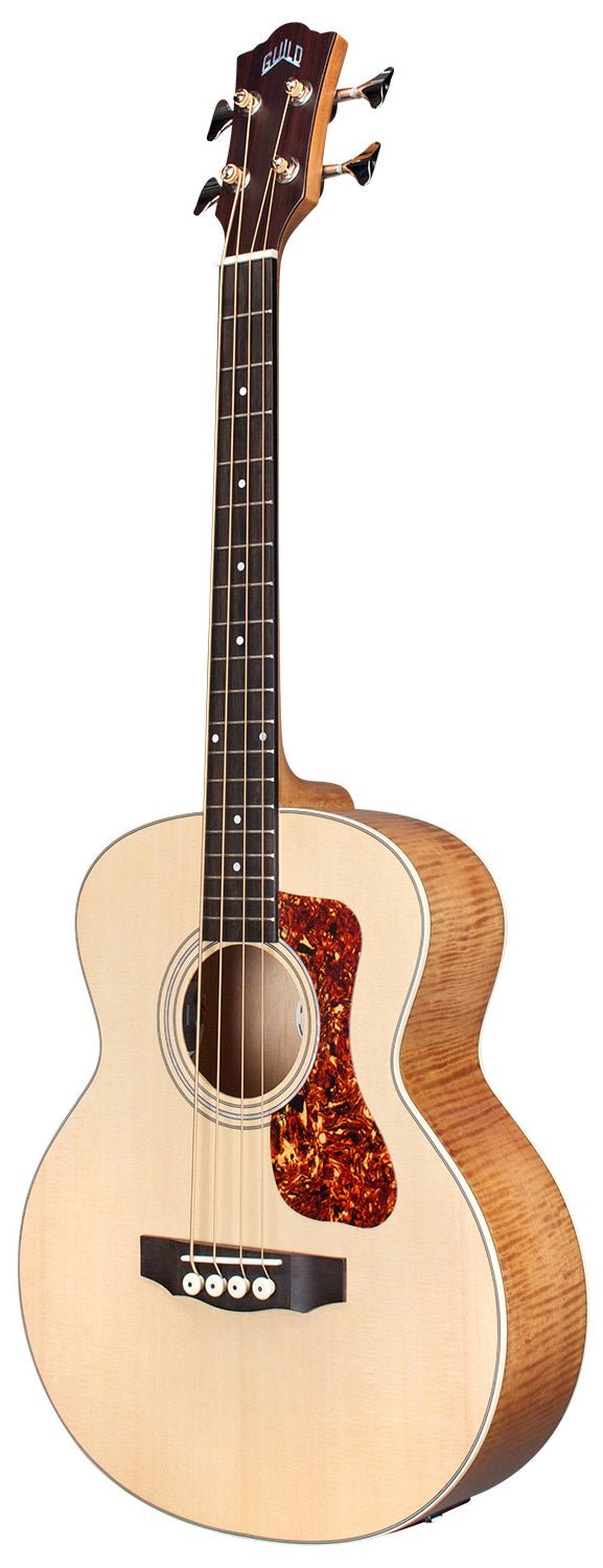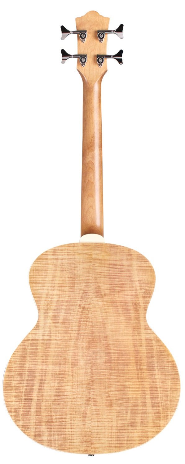 We chose a solid Sitka spruce top and arched flamed maple back to mirror the tone woods that have been used in upright bass construction for centuries, resulting in a clear, tight bass tone that is impressive for its reduced size. The back, sides and neck are finished in a satin antique blonde finish, which adds a rich depth and unique character to the wood’s figure. The Jumbo Junior Bass’s deep voice can be amplified or recorded using its on-board Guild's Fishman-designed BT-1 Pickup System with built in volume and tone controls. Other standout features include an ebony fingerboard and bridge, bone nut and saddle, mother-of-pearl rosette and Guild peak headstock logo, tortoiseshell pickguard, and nylon-core phosphor bronze strings.