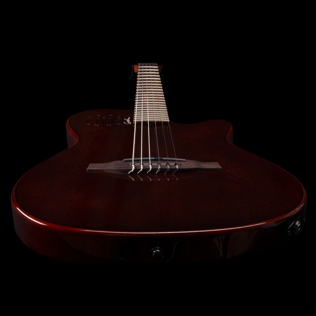 Available in a variety of colors, the Multiac Mundial is manufactured in our Canadian factories with the same high standards as our other instruments. A more modern and stylish variation of our other Multiacs, this nylon string guitar is the result of years of research and development. The Multiac Mundial is distinguished by the wood used (Silver Leaf Maple body, Cedar top, and Spanish Cedar neck), making it an ultra-light instrument, ideal for stage musicians or travelers. The Godin Double Source Custom preamp, the same as on the Encore models, allows you to mix the undersaddle pickup with the sensors in the guitar for maximum versatility. To achieve the most natural acoustic sound possible, we’ve returned to our hollow-body design, so the guitar is lighter, breathes, and resonates without feedback.