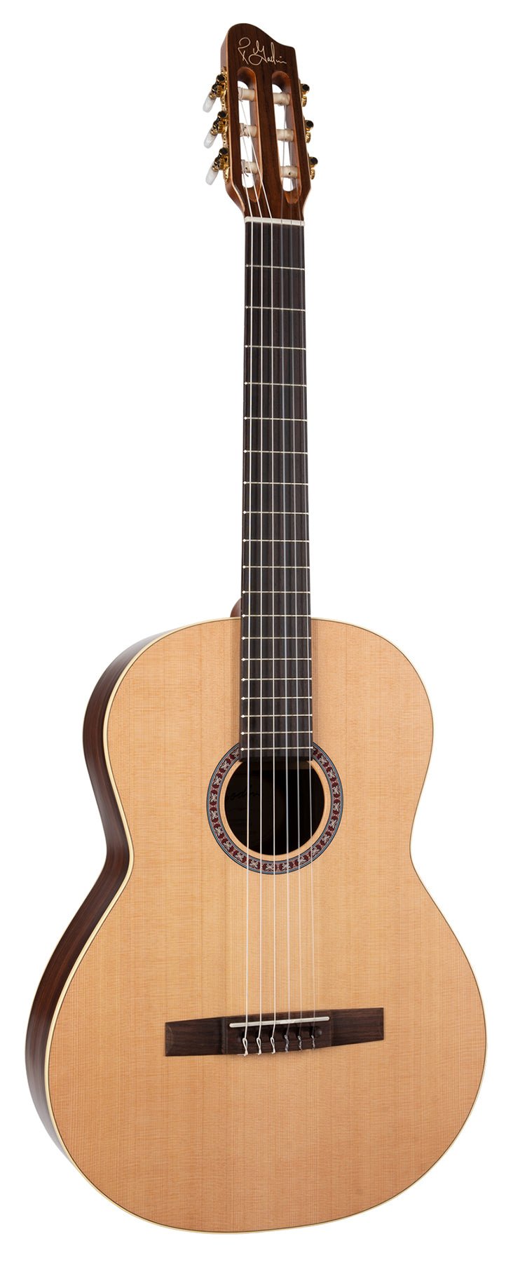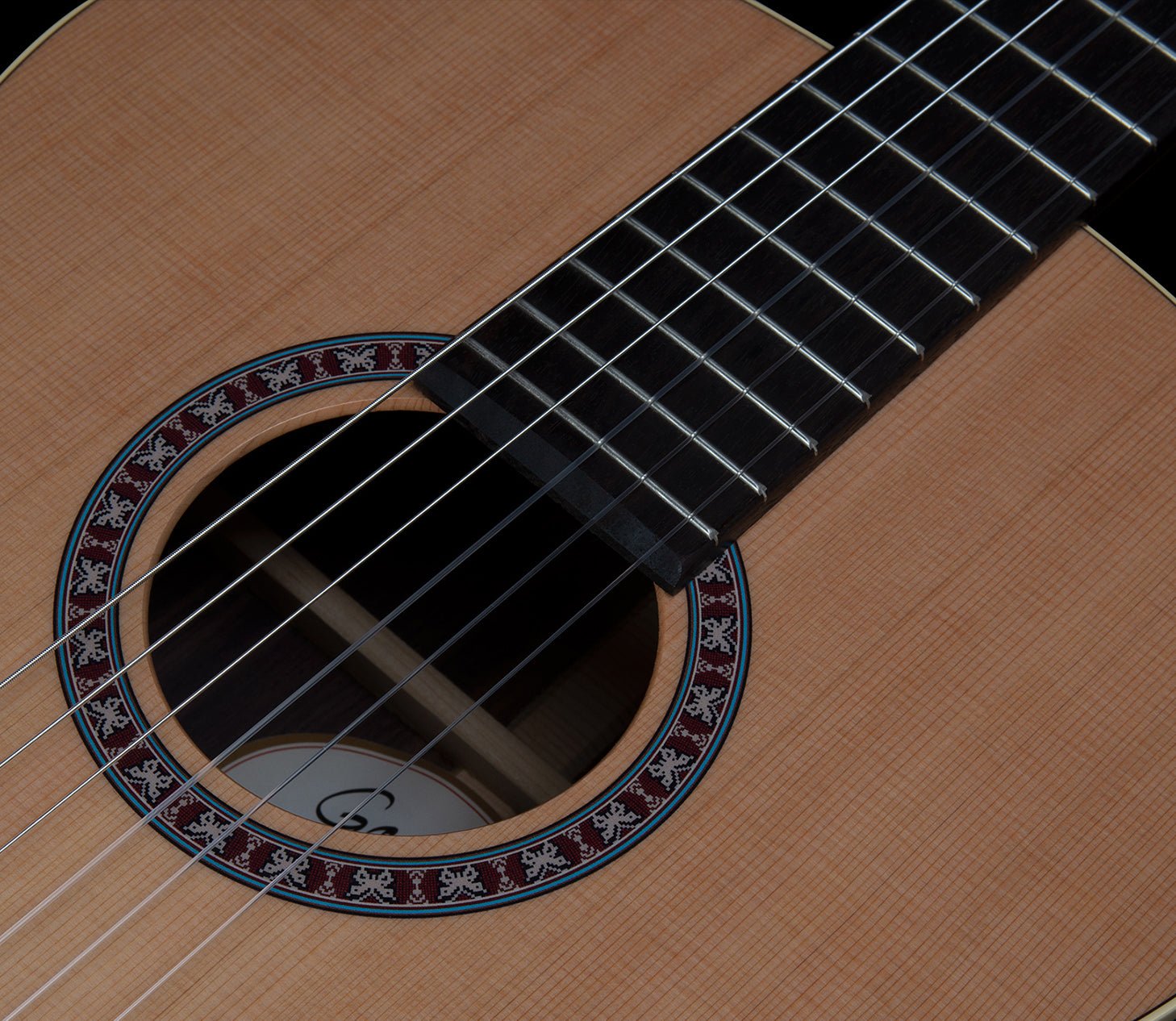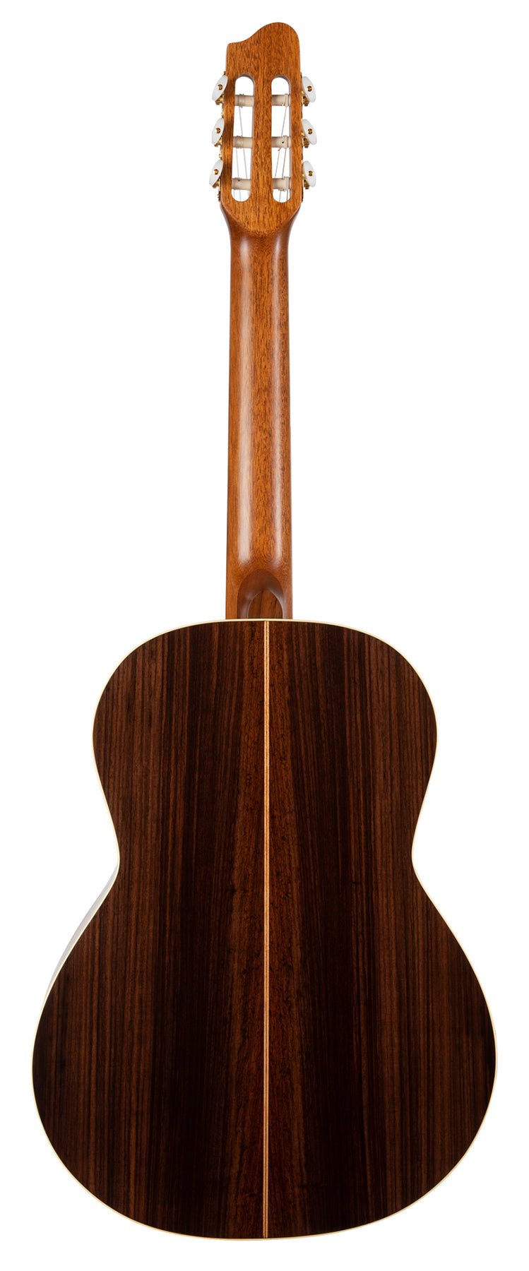 Les guitares classiques du passé étaient généralement fabriquées avec des dimensions de manche épaisses, bien que cela favorisait une certaine stabilité du manche, cela rendait souvent certains aspects de jeu difficiles à exécuter. C'est pour cette raison qu'une attention particulière a été portée au design du manche de ces guitares. La largeur du manche et l'espacement des cordes sont conformes aux normes classiques, mais un nouveau système de truss rod permet de réduire le profil du manche, produisant un manche d'un confort extraordinaire, tout en augmentant la stabilité. Ces manches sont taillés dans de l'acajou du Honduras. Ces modèles sont dotés d'une touche et d'un chevalet en palissandre. Étui vendu séparément.
