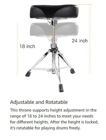 This throne supports height adjustment in the range of 18 to 24 inches to meet your needs for different heights. After the height is locked, it's rotatable for playing drums freely.