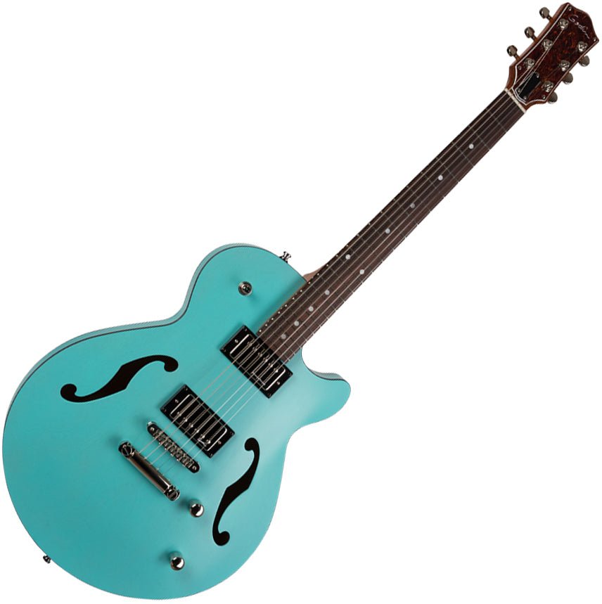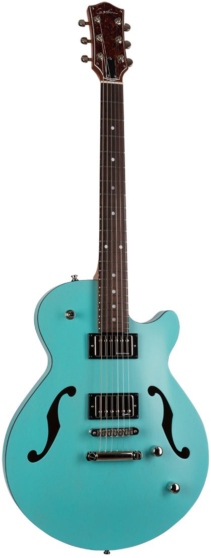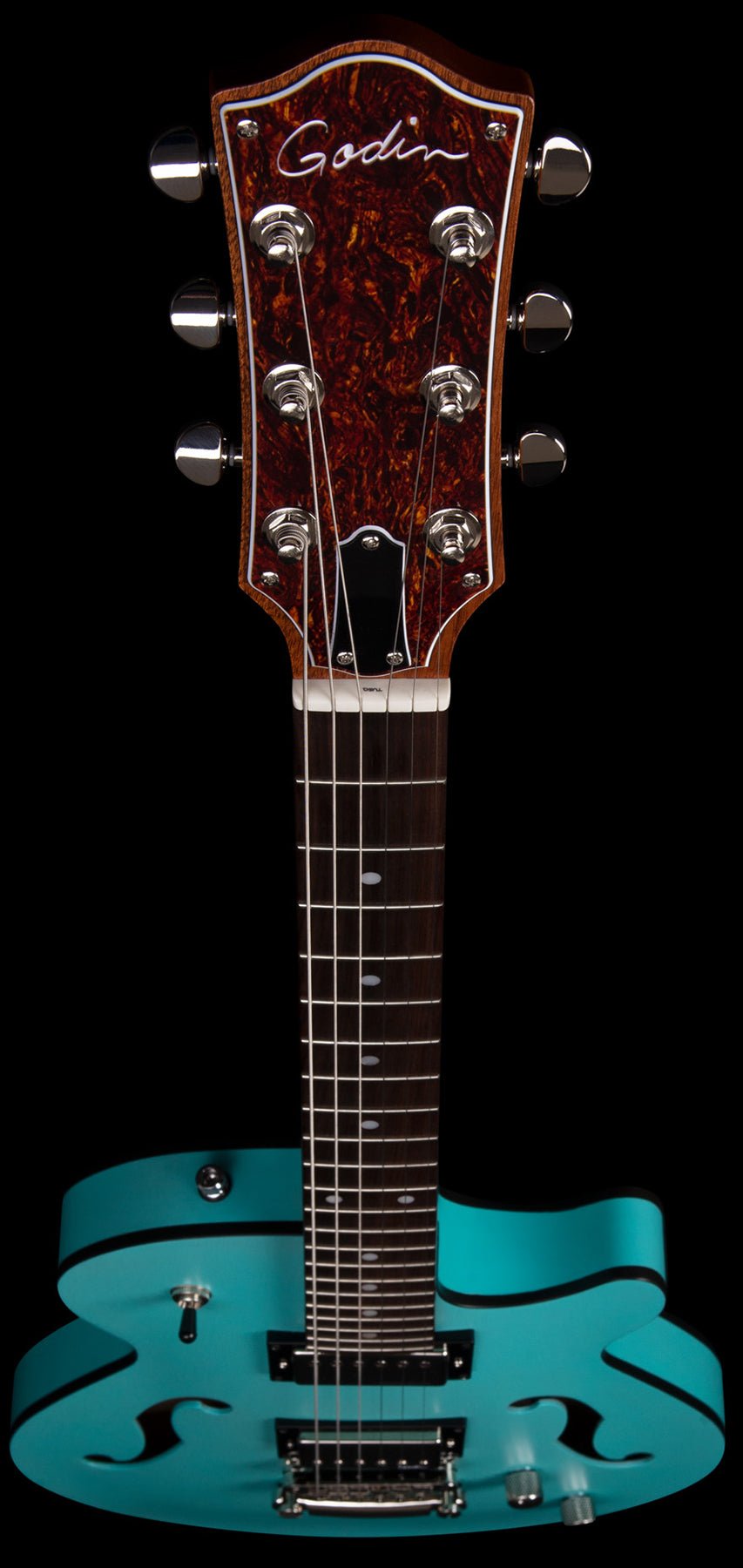 Godin 050215 est une guitare à corps creux RH 6 cordes HT de première montréalaise en bleu laguna