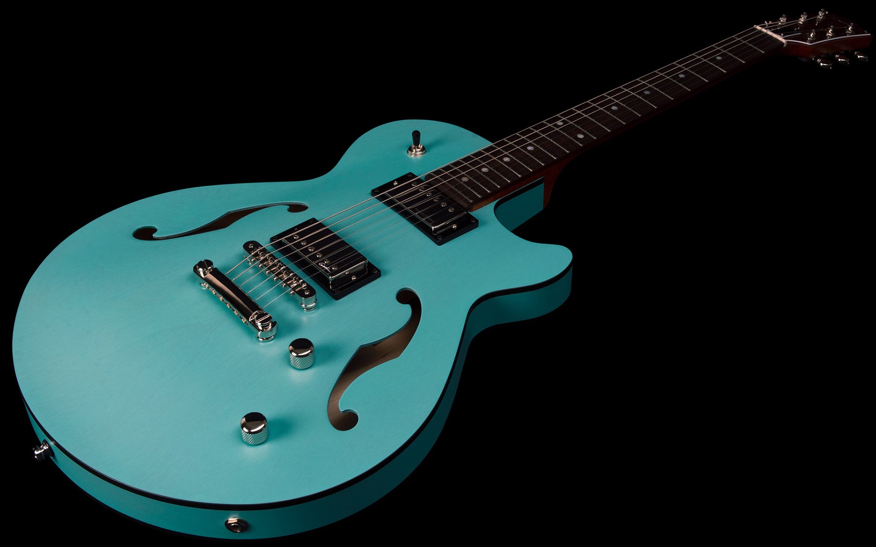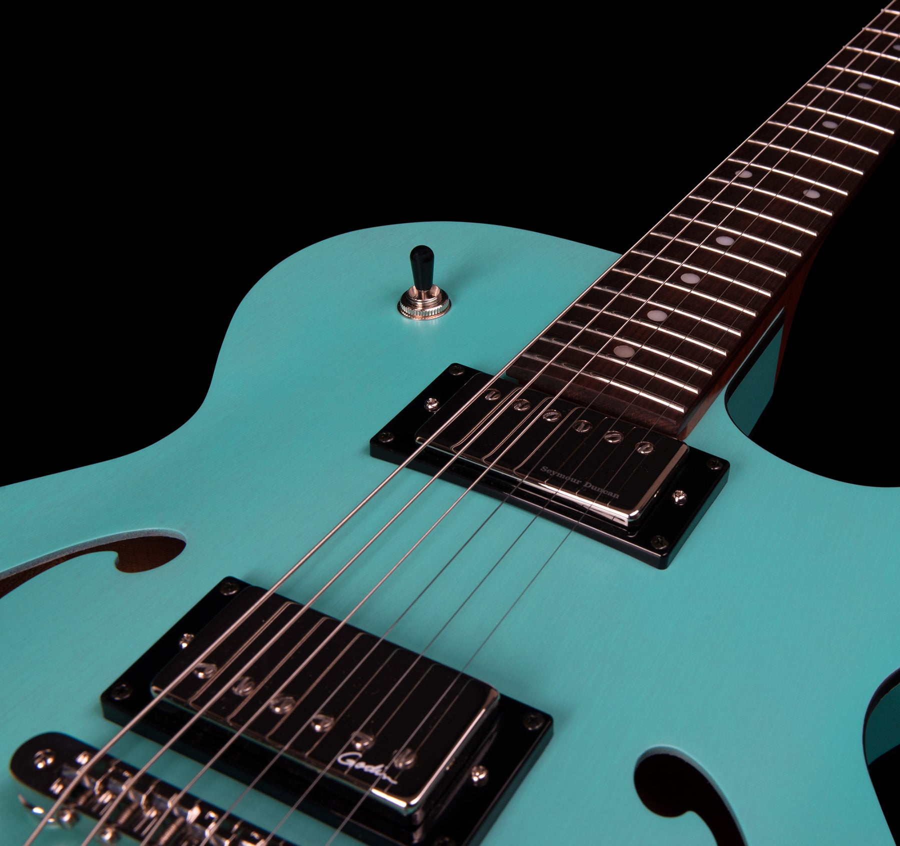 Présentation de la première montréalaise HT Laguna Blue, une guitare vibrante et polyvalente pour les joueurs de jazz, de blues et de rock! Tout comme les autres modèles de première montréalaise, cette guitare a un noyau en cèdre sculpté innovant et unique pour permettre au corps de résonner comme aucune autre guitare de sa catégorie. Mais ce qui rend ce modèle unique, c'est notre nouvelle finition d'inspiration acoustique, qui se prête parfaitement à cette conception de corps semi-creux. Parce que la finition est plus fine et plus organique dans la nature, comme sur une bonne guitare acoustique, elle respire plus librement et offre encore plus de propriétés sonores à la Montreal Premiere HT. Bien qu'il soit parfaitement complété par un chevalet Hard-tail classique, ce modèle de première montréalaise se démarque vraiment avec sa finition bleu Laguna distinctive !