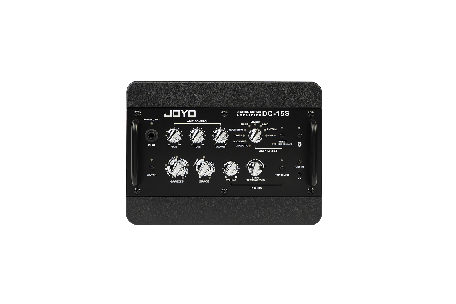 Commandes : Gain, Tone, Volume (pour ampli), Effets d'espace, Effet de modulation, Sélection d'ampli, Préréglage d'ampli, Bluetooth, Looper, Volume de batterie, Style de batterie, Tap tempo