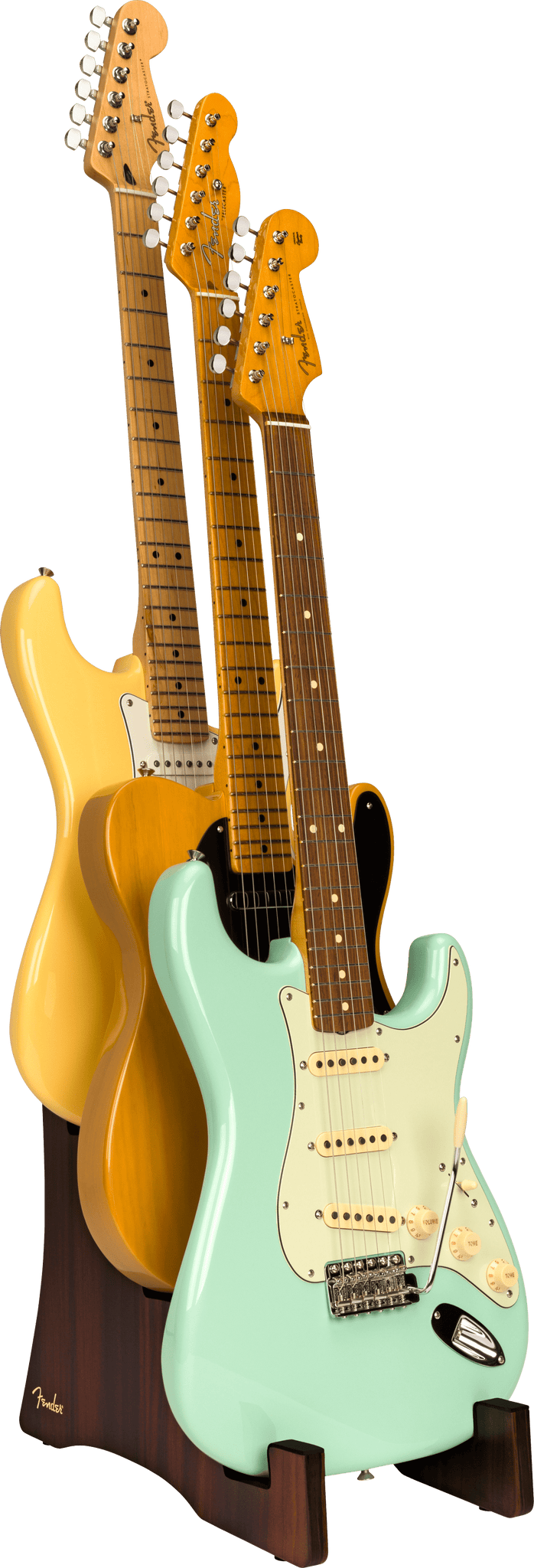 Three guitars at your fingertips! The Fender Deluxe Wooden Tiered Guitar Stand features an eye-catching, mid-century modern design that offers quick access to your favorite electric guitars. The tiered construction allows you to safely display your instruments while maximizing space through its compact design.