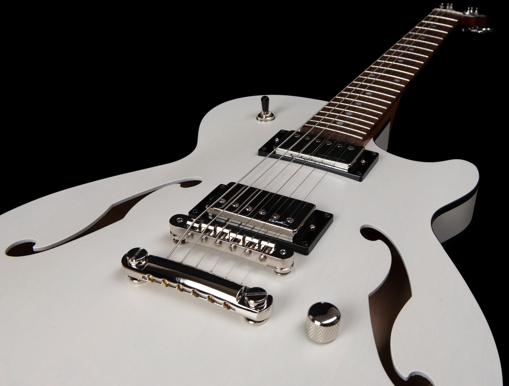 Présentation de la première montréalaise HT Trans White, une guitare vibrante et polyvalente pour les joueurs de jazz, de blues et de rock! Tout comme les autres modèles de première montréalaise, cette guitare a un noyau en cèdre sculpté innovant et unique pour permettre au corps de résonner comme aucune autre guitare de sa catégorie. Mais ce qui rend ce modèle unique, c'est notre nouvelle finition d'inspiration acoustique, qui se prête parfaitement à cette conception de corps semi-creux. Parce que la finition est plus fine et plus organique dans la nature, comme sur une bonne guitare acoustique, elle respire plus librement et offre encore plus de propriétés sonores à la Montreal Premiere HT. Bien qu'il soit parfaitement complété par un chevalet Hard-tail classique, ce modèle de première montréalaise se démarque vraiment avec sa finition pure Trans White !
