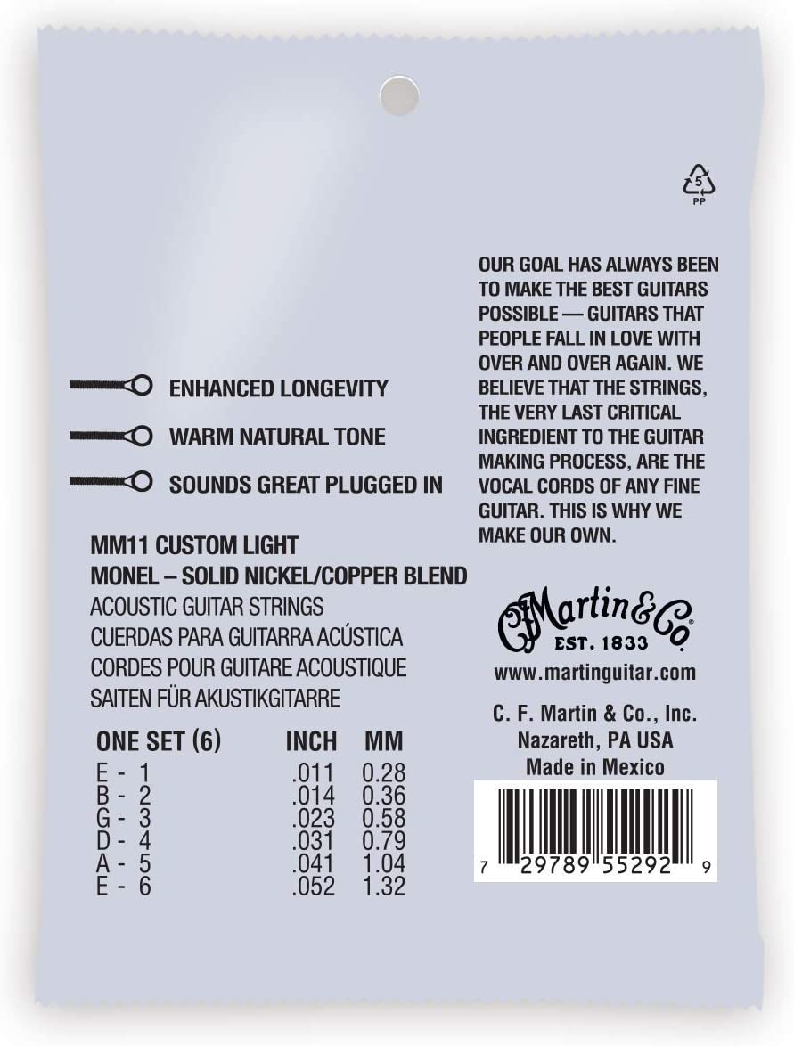 Les cordes Martin Retro® sont la vraie affaire. Pas une imitation. Avec les cordes Martin Retro®, vous obtenez un ensemble robuste qui offre un son vrai et cohérent et un son unique sur le marché. Le mélange solide d'alliage de nickel/cuivre de Martin offre une attaque de médiator réduite qui permet aux bois de tonalité de la guitare d'être entendus, et non éclipsés. Le fil d'enroulement Monel exclusif de Martin est naturellement résistant à la corrosion, vous pouvez donc les jouer pendant longtemps sans que rien ne gêne votre musique. Découvrez la vraie voix de votre guitare. Les cordes Retro® offrent une longévité accrue avec un son naturel chaud et elles sonnent bien lorsqu'elles sont branchées.