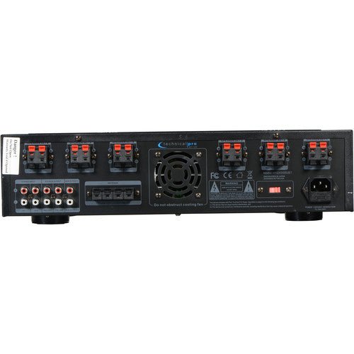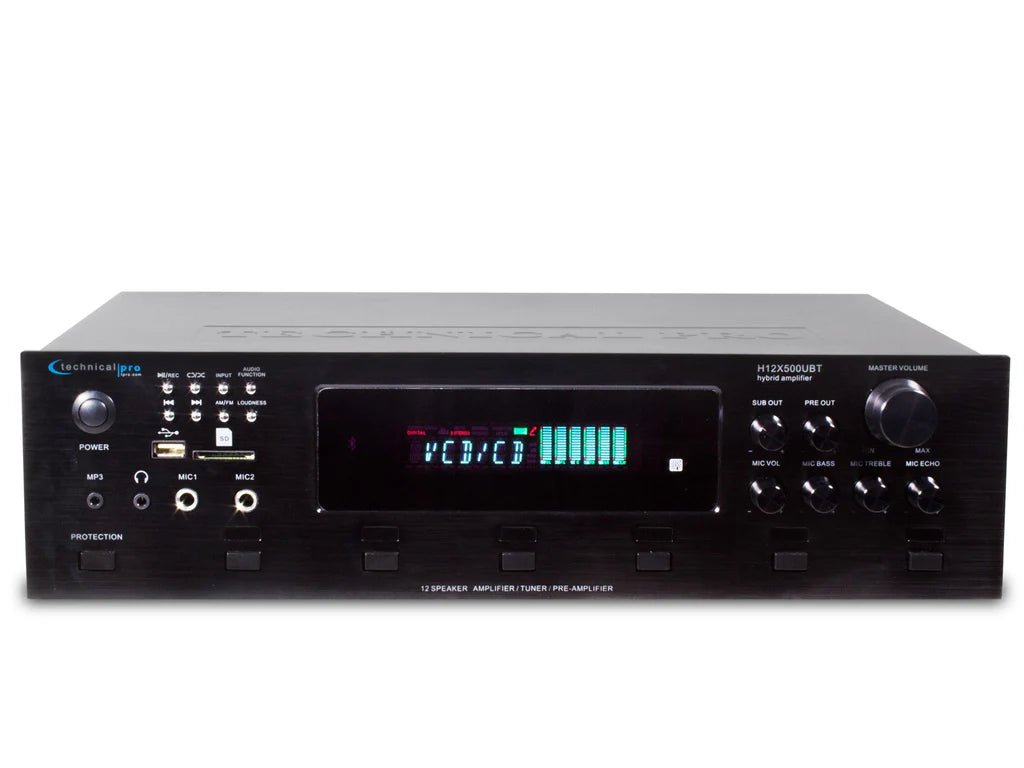 The H12x500UBT 650W Digital Hybrid Amplifier/Preamp/Tuner with 12 Speaker Output from Technical Pro outputs 650W RMS per channel at 1.0% THD. The amplifier plays various formats such as MP3, WAV, WMA files from USB drives and SD cards. The iPod compatible USB input allows for direct connection with an iPod. Thanks to the Bluetooth compatibility, the unit is able to establish a wireless connection to any A2DP stereo. The amplifier draws a peak power of 6000W.