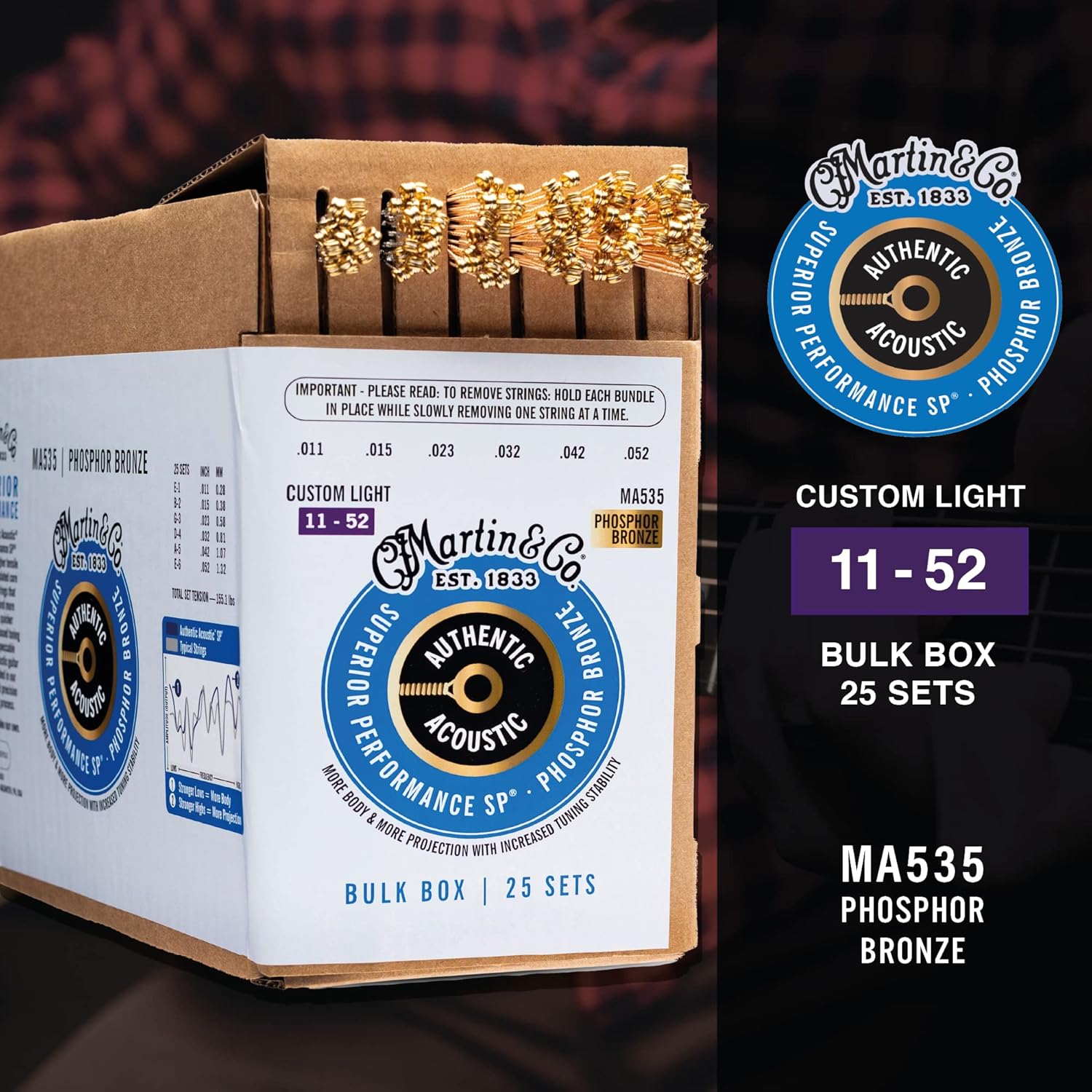 | Custom Light | .011 | .015 | .023 | .032 | .042 | .052 | 155.1 | MA535 |