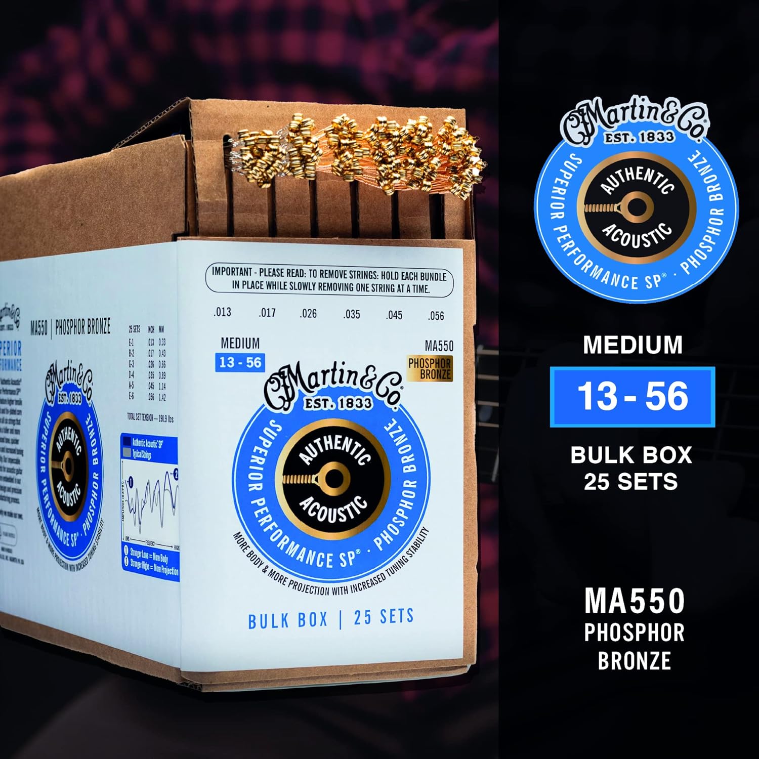 Martin® Authentic Acoustic® Superior Performance SP® strings feature higher tensile strength and tin-plated core wire on all six strings that enable a fuller and more balanced tone, quicker response and increased tuning stability. Our impeccable standards for acoustic guitar tone are embedded in our string design and precision manufacturing process. That's why we make our own.
