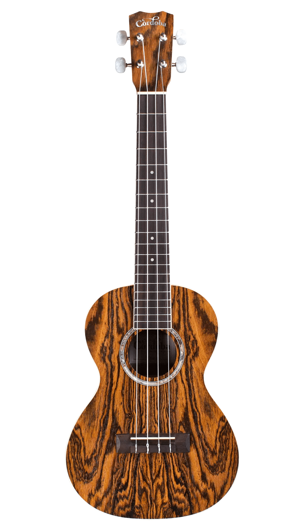 The Cordoba 15TB-E Bocote Tenor Acoustic-Electric Ukulele is a handcrafted ukulele made from stunning Bocote wood and equipped with a Fishman pickup. This premium tenor ukulele offers professional-grade tone and playability for the discerning musician. Its resonant solid bocote top, back and sides provide rich, complex tones with pronounced midrange and treble frequencies. The included Cordoba pickup lets you plug in for live performance or recording, opening a world of sonic possibilities with acoustic and electric tones at your fingertips.