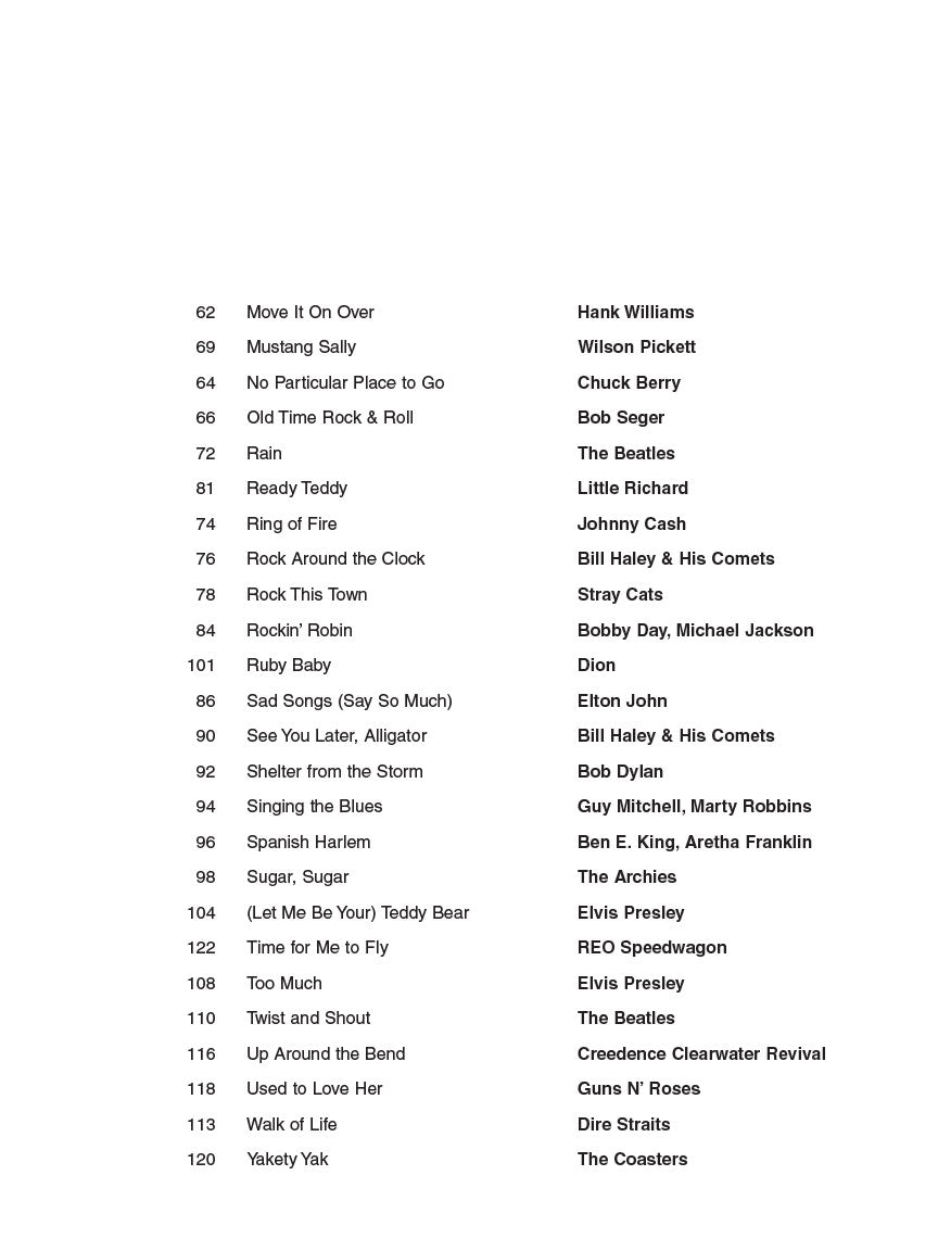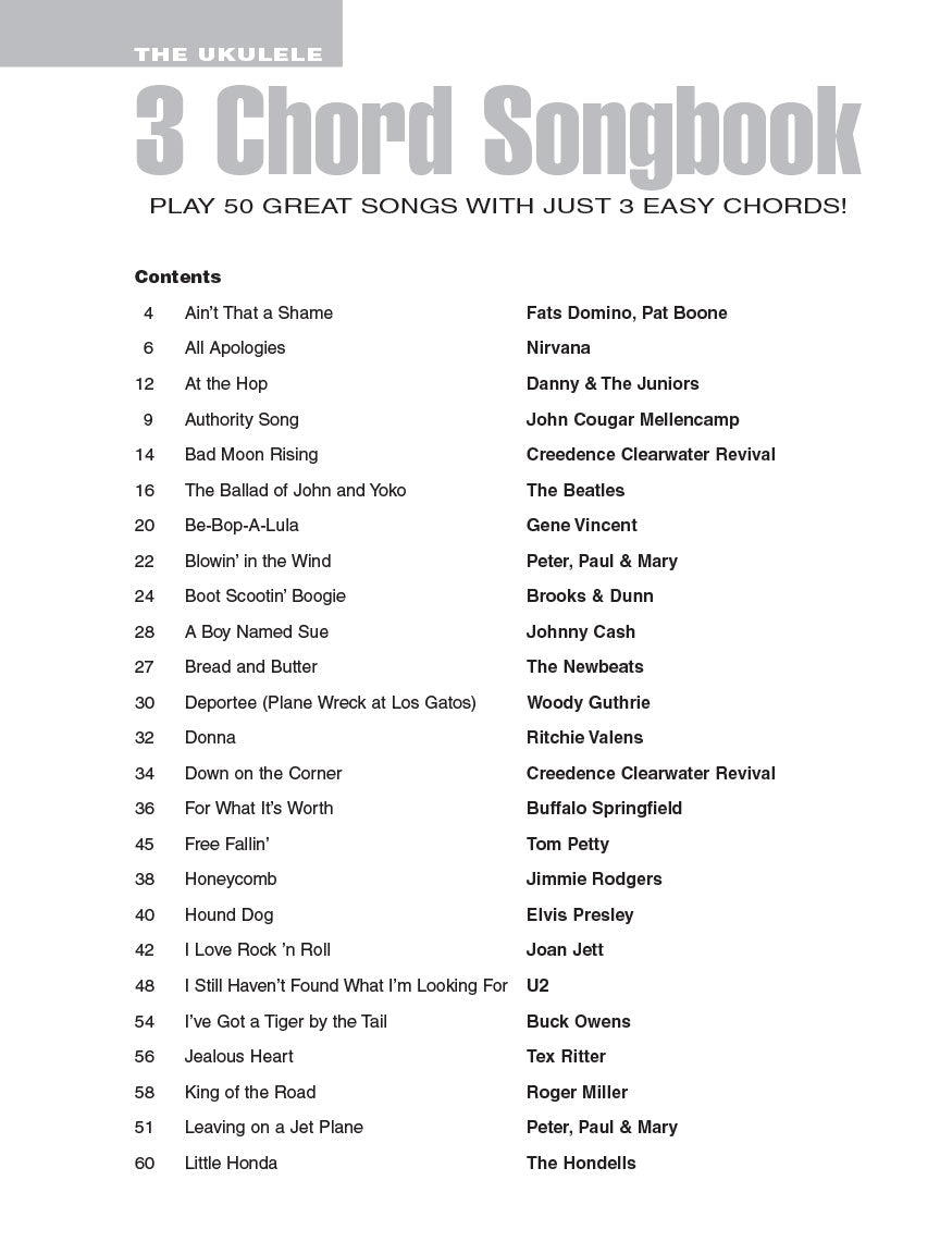 Si vous connaissez trois accords, vous pouvez jouer ces 50 grands succès ! Les chansons incluent : Bad Moon Rising • A Boy Named Sue • Free Fallin' • Hound Dog • King of the Road • Partir en avion à réaction • Mustang Sally • Rock Around the Clock • Shelter from the Storm • Time for Me to Fly • Twist et Shout • et bien d'autres.