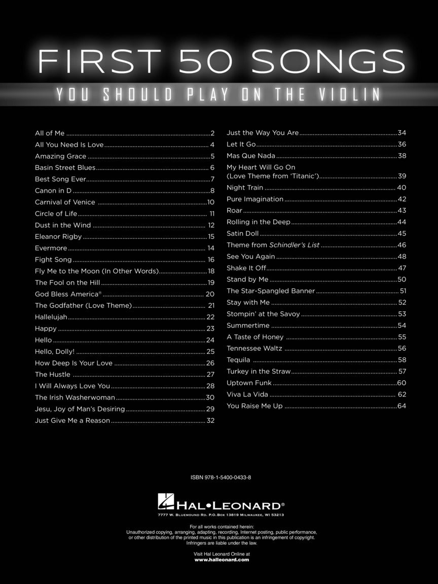 Si vous jouez du violon depuis un petit moment, vous êtes probablement impatient d'apprendre des chansons familières. Ce livre comprend une grande variété de chansons préférées, des tubes pop et des thèmes de films aux mélodies classiques et aux chansons folkloriques, dont beaucoup comportaient à l'origine du violon ! Les chansons incluent : Best Song Ever • Canon in D • Dust in the Wind • Eleanor Rigby • The Hustle • The Irish Washerwoman • Jesu, Joy of Man's Desiring • Pure Imagination • Thème de « Schindler's List » • Summertime • Tennessee Waltz • Turkey in la paille • Viva La Vida • You Raise Me Up • et plus encore.