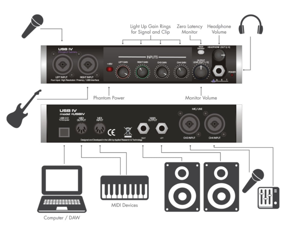 L'USB IV contient des taux d'échantillonnage de 44,1 kHz à 192 kHz pour l'entrée d'ordinateur. L'audio USB est converti à l'aide d'un DAC stéréo bit de haute qualité en audio analogique. Les transformateurs personnalisés suppriment les boucles de masse et autres bruits du système entre le bruit numérique et analogique entre les systèmes audio numériques et analogiques