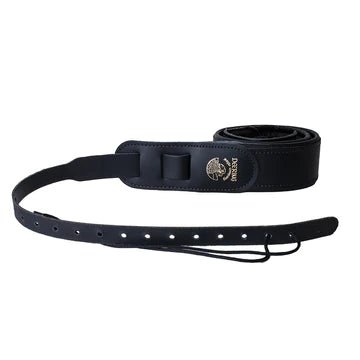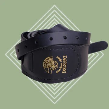 Made in the USA, this black leather cradle strap will protect your banjo at the same time it makes your playing easier. This 2" padded leather cradle strap, printed with a gold Deering eagle logo.