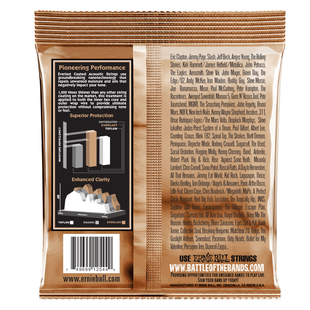 Les cordes de guitare acoustique Ernie Ball Everlast Coated utilisent une nanotechnologie révolutionnaire qui repousse l'humidité et les huiles indésirables qui ont un impact négatif sur votre son. Notre traitement exclusif est appliqué à la fois au noyau hexagonal interne et au fil d'enroulement externe pour fournir une protection ultime sans compromettre le ton ou la sensation. Fabriquées à partir de 92 % de cuivre, 7,7 % d'étain, 0,3 % de fil de phosphore enroulé autour d'un fil central en acier de forme hexagonale plaqué laiton, les cordes Phosphor Bronze produisent des basses riches et chaudes avec des aigus clairs et brillants. Calibres .013, .017, .026, .034, .046, .056
