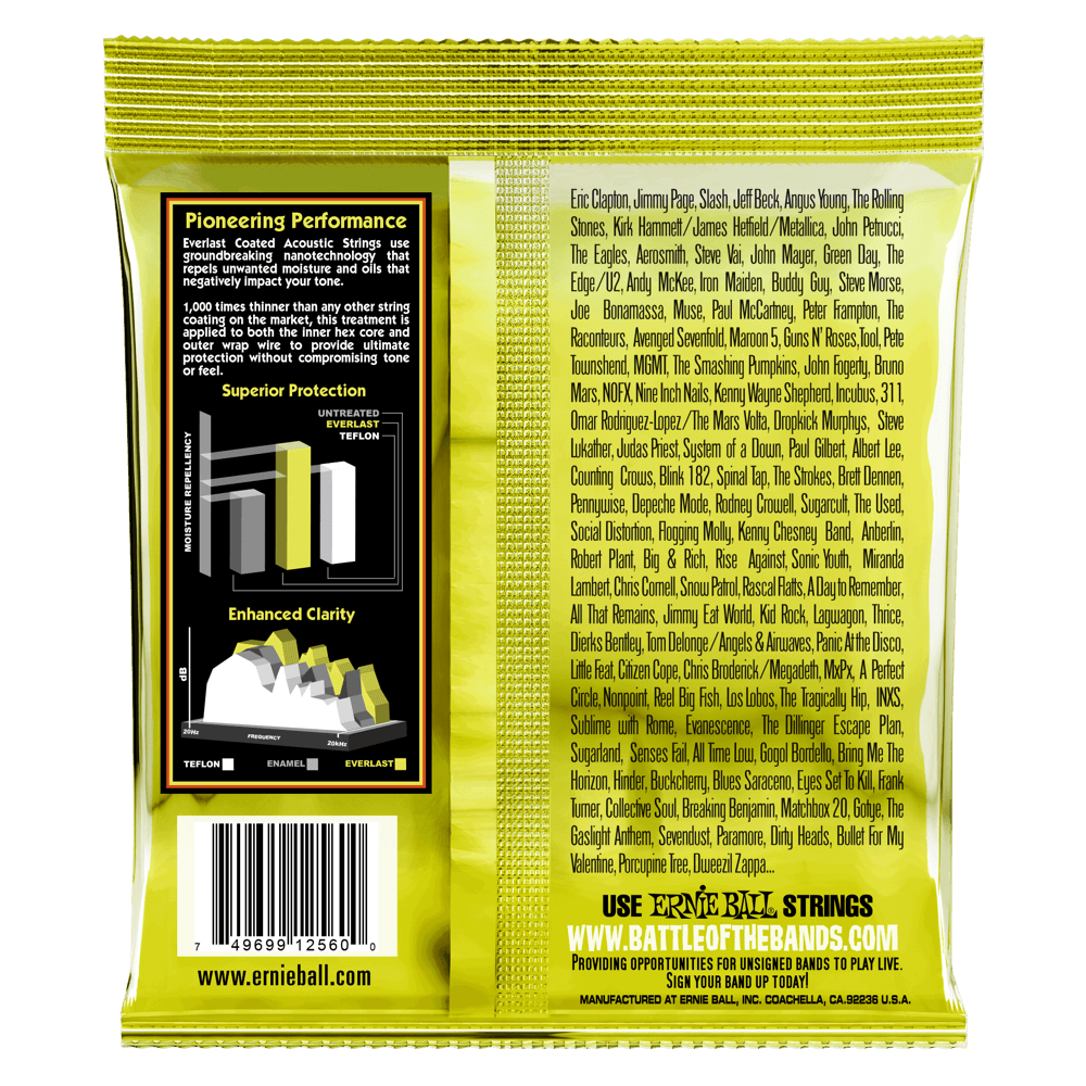 Les cordes de guitare acoustique Ernie Ball Everlast Coated utilisent une nanotechnologie révolutionnaire qui repousse l'humidité et les huiles indésirables qui ont un impact négatif sur votre son. Notre traitement exclusif est appliqué à la fois au noyau hexagonal interne et au fil d'enroulement externe pour fournir une protection ultime sans compromettre le ton ou la sensation. Fabriqué à partir de 80 % de cuivre, 20 % de fil de zinc enroulé autour d'un fil central en acier plaqué laiton de forme hexagonale offrant un son net et sonnant avec des harmoniques agréables. Calibres .010, .014, .020, .028, .040, .050