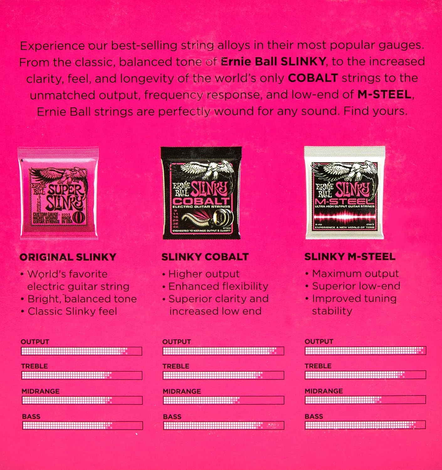 The Ernie Ball Electric Guitar String Tone Pack is the perfect way to experience three legendary electric guitar tones. From the world's #1-selling Original Slinky strings, featuring classic, balanced tone, or the Cobalt Slinky Strings, providing higher output and superior clarity, to the M-Steel Slinky strings, which are the loudest, most expressive strings ever created. Three tones. One Pack. Famously Slinky.