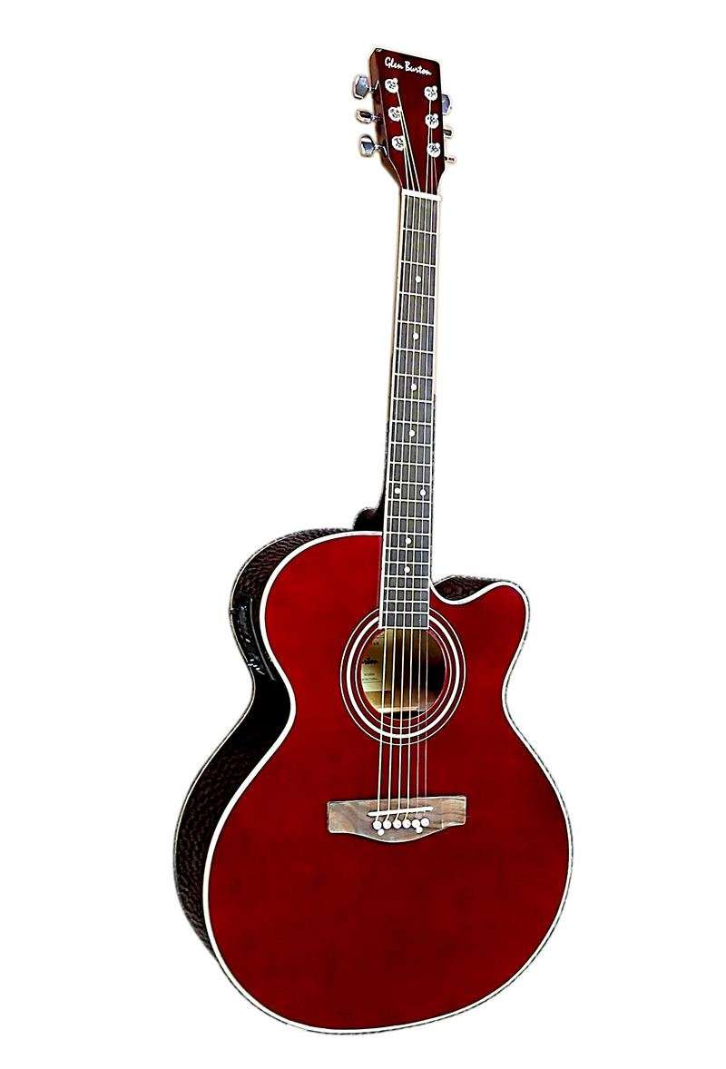 Glen Burton USA jumbo body acoustic electric cutaway guitars in sunburst, natural, and red finishes with spruce top and sapele back and sides