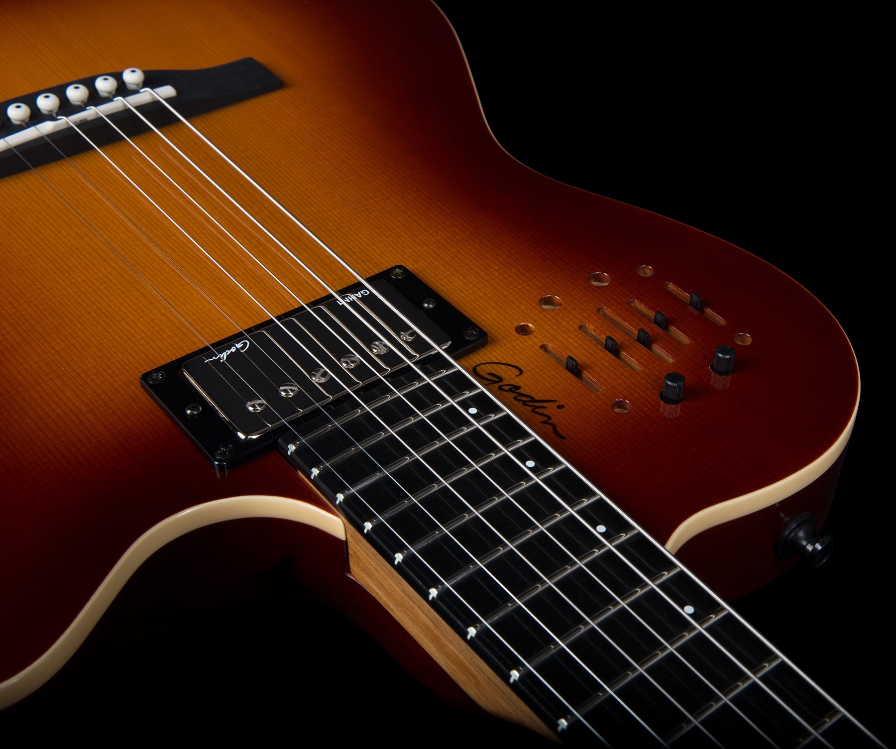 Ces caractéristiques sont vraies et meilleures que jamais dans l'A6 Ultra avec l'ajout de "Oomph!" et le son plein d'un humbucker Godin en position cou, ainsi qu'un transducteur sous la selle, des sorties doubles (acoustique et électrique) qui se combinent pour un son énorme et une section de préampli Godin personnalisée spécialement conçue pour l'A6 Ultra. Cette section de préampli donne au joueur la possibilité de contrôler sa tonalité via des curseurs pour le volume acoustique, les aigus, les médiums, les basses et des commandes indépendantes pour le volume, les aigus et les basses du humbucker électrique.