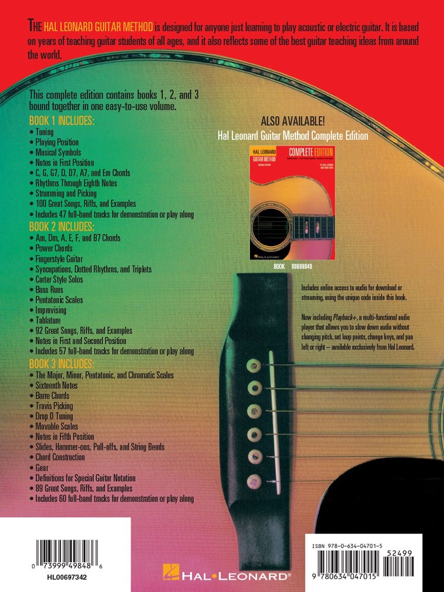 La méthode de guitare Hal Leonard est conçue pour tous ceux qui apprennent à jouer de la guitare acoustique ou électrique. Il est basé sur des années d'enseignement de la guitare à des étudiants de tous âges et reflète certaines des meilleures idées d'enseignement du monde entier. Cette édition complète super pratique comprend les nouveaux livres de méthode améliorés 1, 2 et 3 reliés en spirale ensemble. Cette édition comprend l'accès en ligne à 164 morceaux de groupe complet pour démonstration ou accompagnement. L'audio est accessible en ligne à l'aide du code unique à l'intérieur de chaque livre et peut être diffusé en continu ou téléchargé. Les fichiers audio incluent PLAYBACK+, un lecteur audio multifonctionnel qui vous permet de ralentir l'audio sans changer la hauteur, de définir des points de boucle, de changer les touches et de faire un panoramique à gauche ou à droite.
