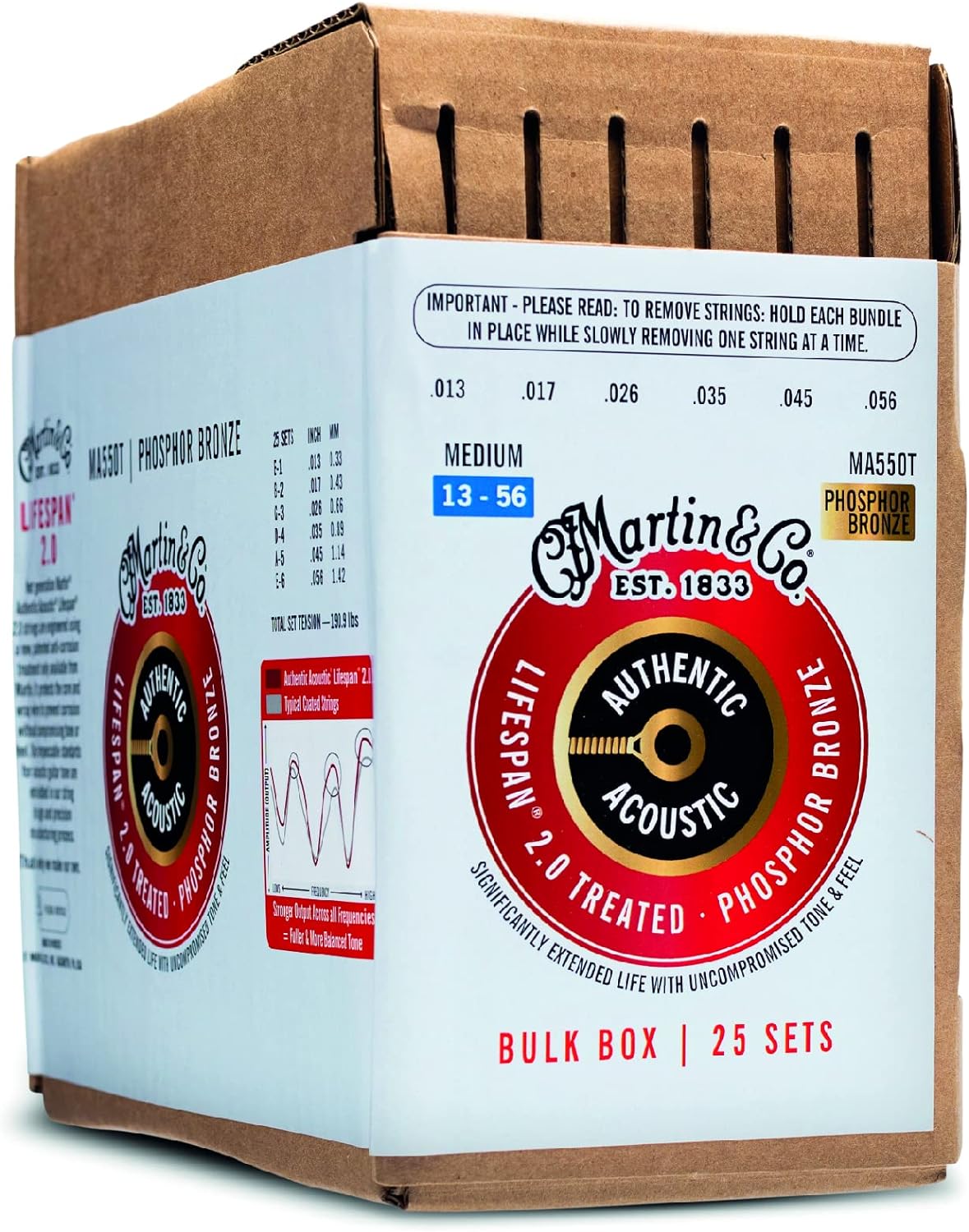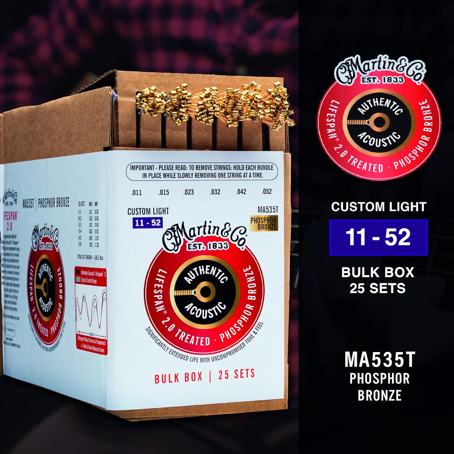 - ACOUSTIC GUITAR STRING SET: Martin Authentic Acoustic superior performance strings are now offered in a bulk box. Each box of bulk string contains 25 sets and is packaged in an easy-to-use system and is designed for corrosion resistance. Choose between a medium, light, and custom light gauge, and you’ll be ready to rock-n-roll.