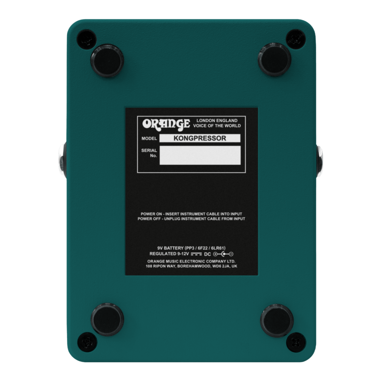Like all Orange pedals, the Kongpressor features an internal charge pump which doubles the operating voltage of the pedal to 18V. This has the effect of drastically increasing the headroom for super clean compression. The Kongpressor can be powered by 9V battery or standard DC adapter, or for even more output can also run on 12V DC.