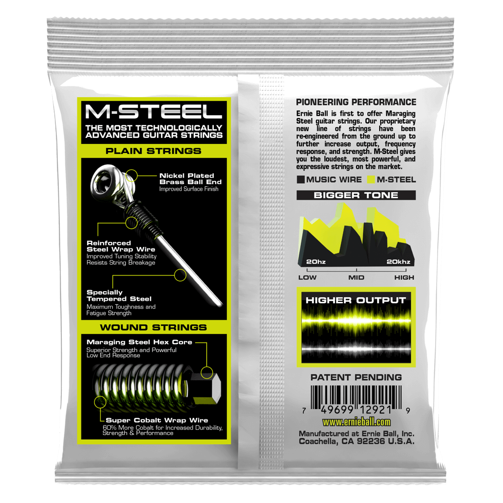 Les cordes de guitare électrique Ernie Ball M-Steel sont fabriquées à partir d'un alliage Super Cobalt breveté enroulé autour d'un fil à âme hexagonale en acier Maraging, produisant un son plus riche et plus plein avec une réponse puissante dans les graves. Les cordes de guitare électrique M-Steel sont composées d'un acier spécialement trempé pour une résistance maximale à la fatigue. Les cordes simples électriques utilisent également un enroulement d'acier breveté autour de l'extrémité de la balle qui réduit le glissement, la casse et reste mieux accordé que les cordes simples conventionnelles. Calibres .010, .013, .017, .026, .036, .046