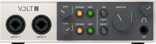 Volt 2 gives you simple 2-in/2-out audio connections. Just plug your mics, guitars, or synths into the front panel. Then connect your speakers or headphones to monitor your audio with no latency. With Volt, you'll be creating like a pro, fast.